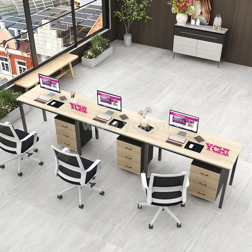 Cụm Bàn Làm Việc 3 Người Không Gian U Space YCHIUS006 mang phong cách hiện đại, thiết kế cổ điển, vuông vức, làm cho không gian văn phòng trở nên sang trọng, lịch lãm, đẳng cấp. Đặc biệt, thiết kế mang đến sự hoàn hảo trong không gian sử dụng, có thể kết hợp với tủ di động để tối ưu không gian lưu trữ.