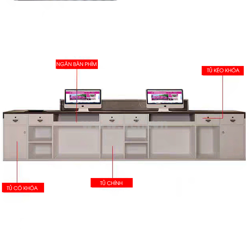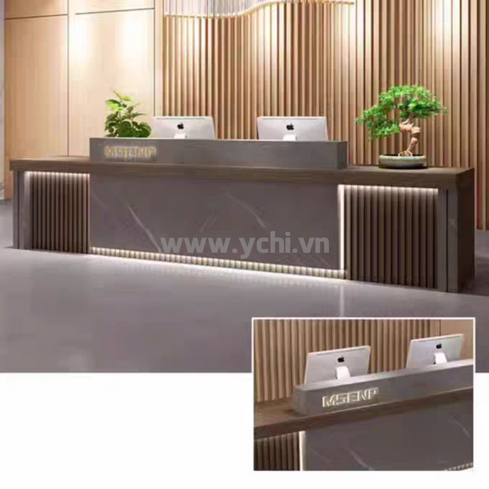Quầy Lễ Tân YCHIRT072 có bên trong được thiết kế dành cho từ 1-2 nhân viên lễ tân sử dụng thoải mái và tiện lợi nhất. Sử dụng chất liệu gỗ công nghiệp cao cấp, khả năng chống ẩm mốc tốt, không lo mục ruỗng theo thời gian sử dụng đồng thời tạo vệ sinh lau chùi dễ dàng. Ấn tượng với sự phối hợp hai tông màu sáng và tối; mặt phía trước ốp gỗ và thanh nẹp trang trí vô cùng sang trọng và thanh lịch, khách hàng có thể nhìn thấy chúng trước khi quan sát xung quanh.